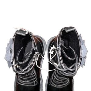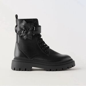 Zara Girls Lace up Ankle Black Boots. Side zipper, Flower detail. NWT