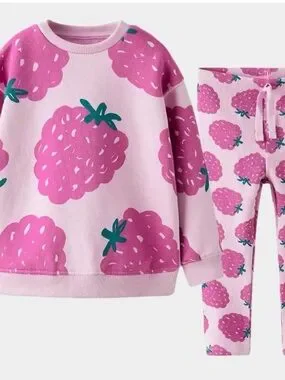 Cute pink berry set featuring bold berry prints. Soft, breathable fabric for comfortable play. Elastic waistband and ribbed cuffs for easy wear.