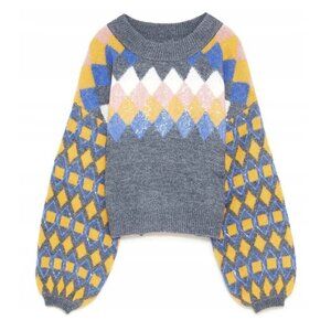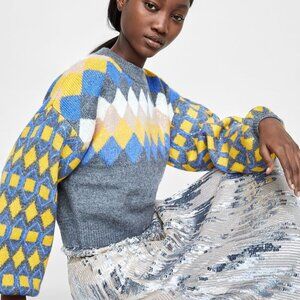 Zara Knit Glittery Diamond Argyle Sweater. features a distinctive glittery diamond argyle pattern in multiple colors, including gray, yellow, blue, pink, and white.The sweater has long balloon sleeves, a crew neckline, and sequin accents throughout the diamond pattern, particularly noticeable on the sleeves.It's made of a knit fabric blend including polyester, spandex, and acrylic, offering a cozy and oversized fit.
