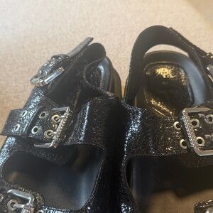 Elegant sandals with glossy finish. Features sleek straps and secure fit.