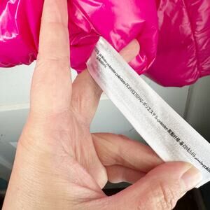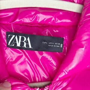 Zara Glossy Shiny Vinyl Puffer Jacket Hot Pink High Neck NEW Size Large L Baddi Water Repellent Material. Condition: New without Tags {NWT}. Small mark on back of right sleeve. See last pic. Difficult to see in my honest opinion unless looking under bright light. May come out in the wash. I didn’t wash this item because it still has the tags. Full from zip. Wind protection and water repellant. High neckline. Cropped fit. Hidden front zippered pockets. Cropped style. Shell: Polyamide. Lining and fill = Polyester.