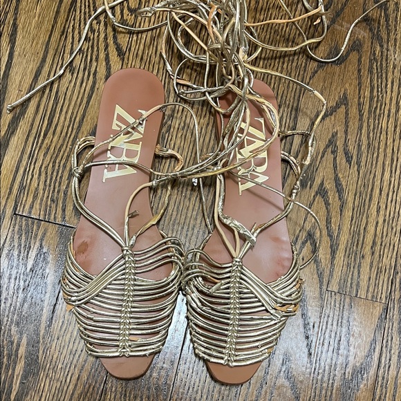 Step out in style with these elegant gold strappy sandals from Zara. Perfect for any occasion, these shoes offer both comfort and fashion.