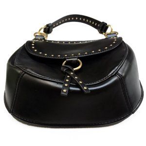 Oval Shaped. Flap with gold metal ring details. Antique gold studs at flap and handle.