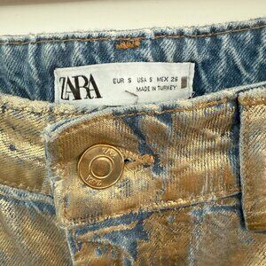Make a bold statement with this stunning Zara denim skirt featuring a unique gold-dipped finish! This long, fashion-forward piece combines classic denim with a metallic twist. Designed with a flattering high waist and a back slit for added edge and movement. Size Small and in excellent condition. Only worn once and comes from the Zara Tokyo store.