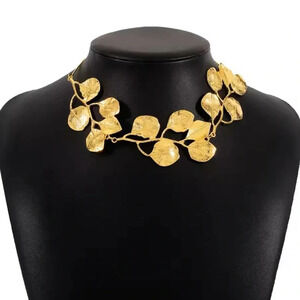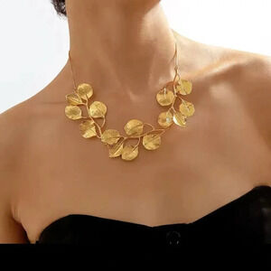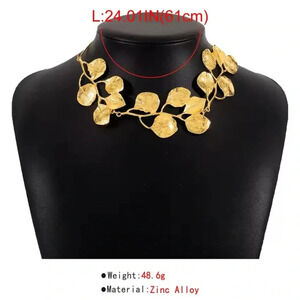 - **Design**: The necklace has a bold and unique design with what appears to be golden leaves linked together, creating a nature-inspired look.