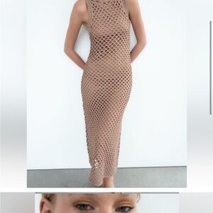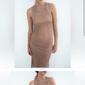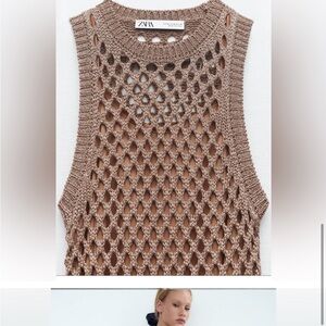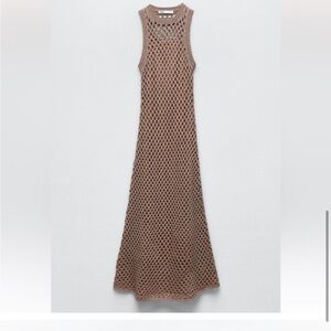 Elegant golden knit dress. Features round neck and sleeveless design. Metallic thread detail adds shine.