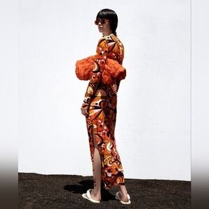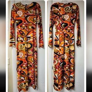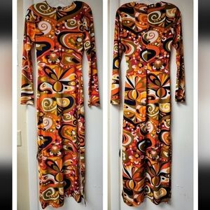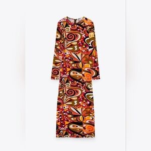Zara Limited Edition Goovy Multicolored Mod 1970s Style Slit Sides Maxi Dress Long Sleeve Size S