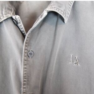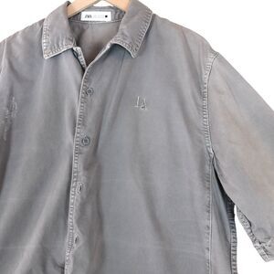 This Zara Man shirt is cut in a relaxed, oversized boxy silhouette that channels both streetwear and minimalist utility. Made from 100% cotton in a washed gray tone, it features short sleeves, tonal button front, and embroidered LA detail on the chest for a subtle but bold nod to city pride. The fabric has a naturally faded, distressed look that enhances the laid-back urban vibe.