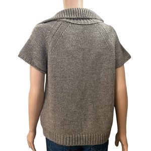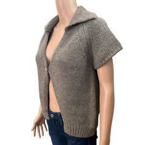 Stylish gray cardigan with short sleeves. Features a single button closure. Perfect for layering.