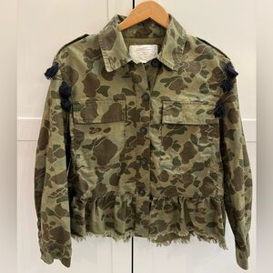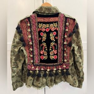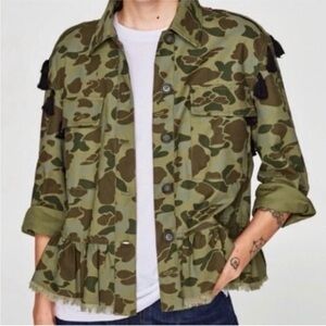 Zara Green Camouflage Army Jacket Boho Embroidered Floral Tassel Womens Sz S