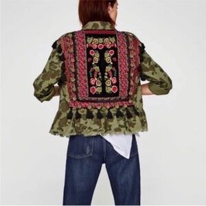 Zara Green Camouflage Army Jacket Boho Embroidered Floral
