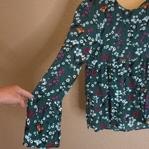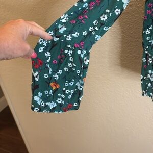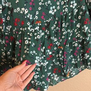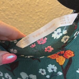 This Zara blouse features a vibrant green floral pattern with delicate ruffles. Buttons in back, cute sleeve detail. Size small, 18” pit to pit, 21” shoulder to hem.