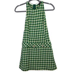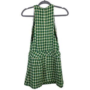 Adorable Zara Houdstooth Textured Pinafore Dress in green with tweed cream, black, and lime woven detail. Sleeveless fitted mini dress with belt detail at waist and decorative buttons. High neck, back zipper closure. Wear alone or pair with a white turtleneck for acadamia vibes. Worn by Rachael on the Bachelor. Cotton and wool blend. Excellent condition. Women's XS extra small, measurements pictured.
