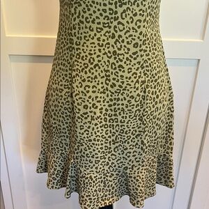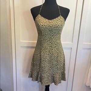 Stylish mini dress with leopard print. Halter neck design. Flared hem for a chic look.