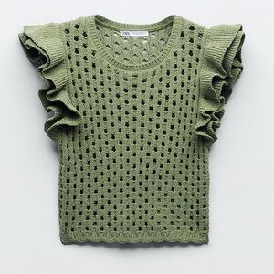 This elegant green sweater from Zara features dramatic ruffled cap sleeves and a decorative open-knit pattern, offering a chic and breathable design perfect for any occasion.