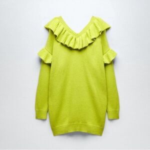 Zara Lime Green Tunic Ruffled Knit Sweater, V-neck, Ruffles with long sleeves, Asymmetrical Hem with side vents, Rib Trim. NWT
