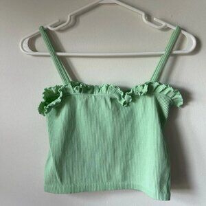 Feminine and stylish Zara ruffled tank top in a beautiful green shade. Features delicate ruffle detailing and a flattering fit — perfect for spring and summer outfits, pairing with jeans, shorts, or skirts for an effortless chic look.