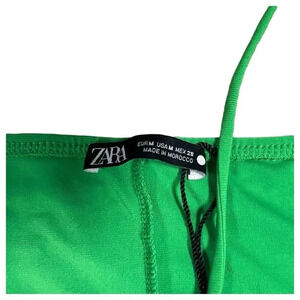 This beautiful green midi dress from Zara is perfect for any occasion. The dress features a square neckline, strappy sleeves, and a pullover closure. The sleeveless design and stretchy polyester/elastane material make it comfortable to wear in the summer, spring, or fall. The dress comes in a size medium and has a flattering bodycon fit that complements any figure.