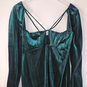 Features: V-neck dress with long sleeves. Cut out detail. Beautiful emerald green. 93% polyester, 7% elastane.