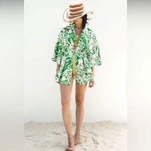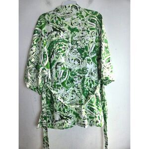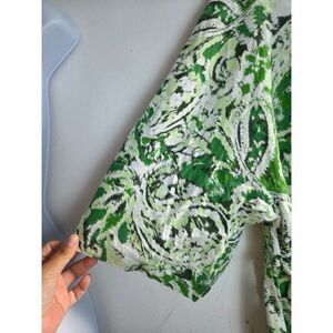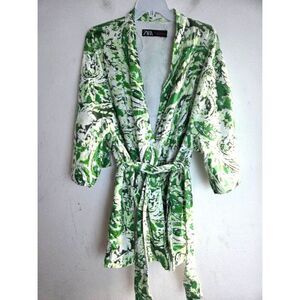 Zara Women Green White Black Print Linen Blend Bubble Sleeve Tie Front Kimono size Large