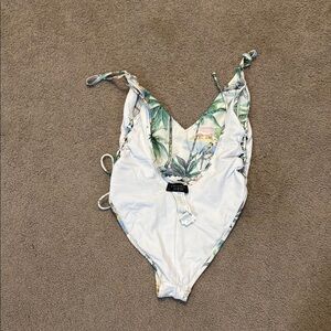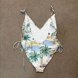 Dive into summer with this chic Zara one-piece swimsuit, featuring a vibrant green and blue tropical print. The elegant design is perfect for beach or poolside relaxation, offering a flattering fit and stylish appeal. Great condition. No pulls or pilling. Adjustable string sides.
