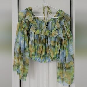 This Zara blouse features a romantic off-the-shoulder design with ruffled details and a crop length. The watercolor-like print in green and blue creates a dreamy, nature-inspired look, perfect for adding a touch of elegance to any outfit.