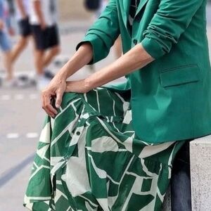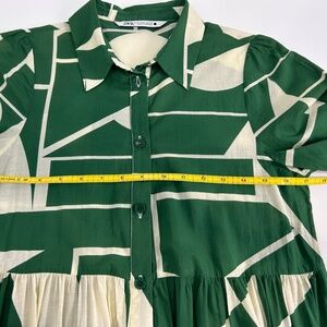 Stylish midi dress with a bold geometric pattern. Features a button-down front and long sleeves. Perfect for any occasion.