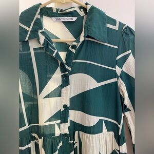 Stylish green and white dress with geometric patterns. Features 3/4 length sleeves and button-up front. Ideal for a modern look.