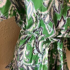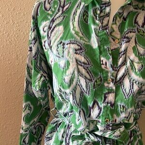 Stylish Zara dress with a vibrant green and white pattern. Features a tie waist and buttons in the front with a collar. It is sheer throughout.