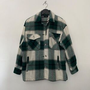 Zara Green and White Plaid Unlined Button Down Shirt Jacket Shacket