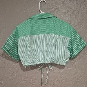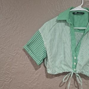 This stylish top from Zara features a fresh green and white striped pattern, perfect for a casual summer look. The short sleeves and notched collar add a classic touch, while the tie front detail offers a modern twist. Ideal for warm days, this crop shirt combines comfort and style effortlessly.