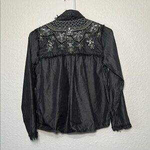 Stylish grey button-up shirt with intricate embroidery on the shoulders. Perfect for a chic look.