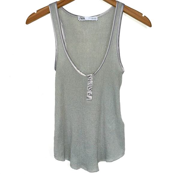 Zara Grey Scoop Neck Snap Sheer Viscose Linen Mesh Knit Tank Top