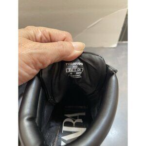 The Zara Grunge Goth Bikercore black platform stack-heeled lace-up ankle boots in size 39 (8.5 US) are a stylish and edgy addition to any wardrobe. Featuring a round toe shape, solid black color with quilted accents, and a high block heel, these boots are perfect for a variety of occasions from casual to party or workwear. Made of faux leather with a rubber outsole, these biker-style boots embody a grunge theme and are sure to make a statement. The lace-up closure adds a touch of convenience and the ankle shaft style provides a trendy fit. These boots ship as seen in photos