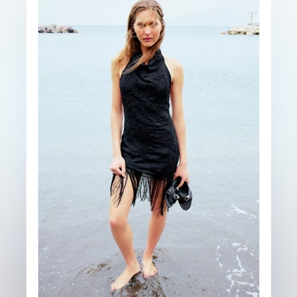 Stylish black halter dress with fringe detail. Perfect for a beach outing.