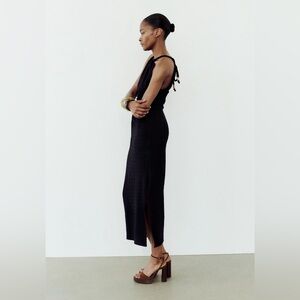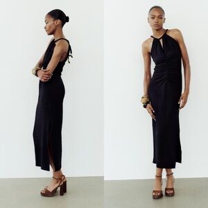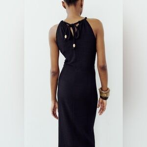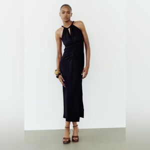 Halter neck dress with adjustable tie at back and wood beads. Sleeveless. Front ruching. Side slit at hem.