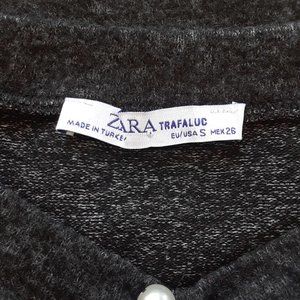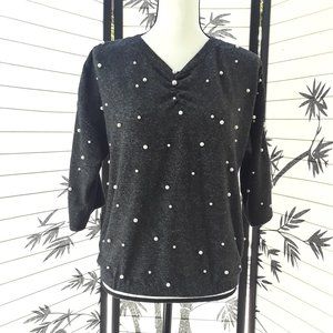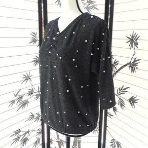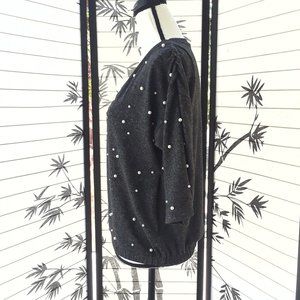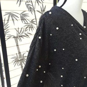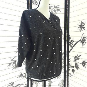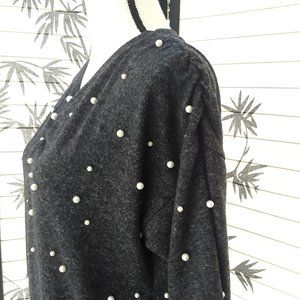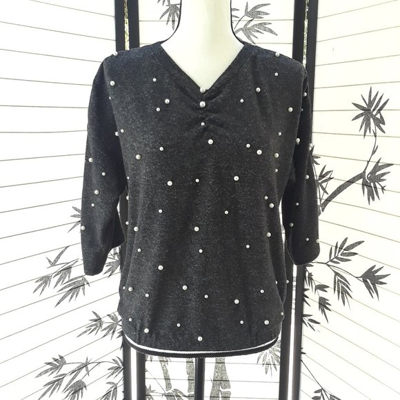 Features a ruched V neck and 3/4 length sleeves. Very soft, fuzzy fabric with sewn on pearls throughout. The waistline is elastic and the shoulders are ruched.