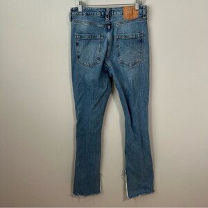 Zara High Rise Blue Flare Wide Leg Jeans Distressed Denim Split Hem Women’s 6