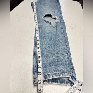 They are a popular style known for their high-waisted, straight-leg design with distressed details at the knees.
