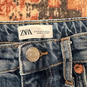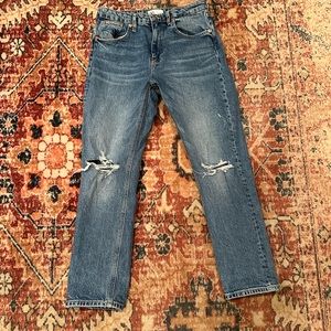 Zara High Rise Slim Fit jeans with ripped details at the knees. Only worn once! Slight distressed details throughout, shown at the hem of the pants. Ripped knees got a bit more exaggerated after going in washing machine. Medium wash. Great condition, cute fit!