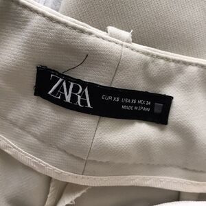Chic Zara high waist pleated trousers in a versatile beige-cream neutral tone. Tailored with a classic pleated front and straight leg silhouette, they offer a polished fit that works from the office to evening outings. The minimalist design makes them a timeless piece for career wear, neutral dressing, and capsule wardrobes. Pair with crisp button-downs for a sharp look or style with a soft knit for modern sophistication.