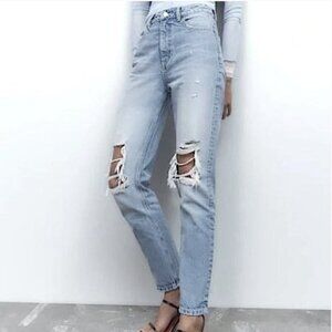 Zara High Waisted Mom Jeans Ripped Knee Straight Leg Size 4