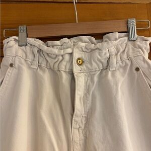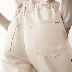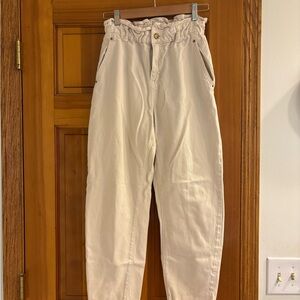 Zara High waisted paper bag barrel jeans size 2 (run kinda big in my opinion). Off white color. In great condition, but have one small spot I have not tried to treat. See last photo for spot.
