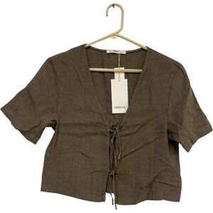 Zara Womens Blouse Small Brown Linen Blend Bow Short Sleeve 4114/579 NWT