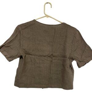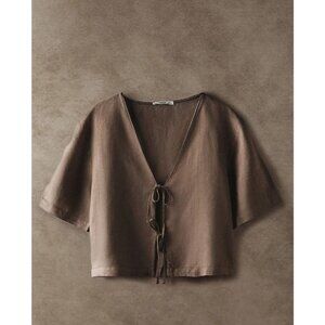 Zara Home Womens Blouse S Small Brown Linen Blend Bow Short Sleeve 4114/579 NWT