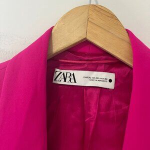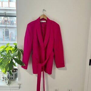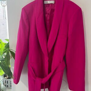 Zara Hot Pink Blazer Size XXL. Hot pink color. Adjustable belt/tie at waist. Longsleeves. Long length - hits below the butt, depending on your height. Collared. Fully lined.