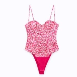 Zara Hot Pink and White Floral Corset Bodysuit Sweetheart Neckline- Size M