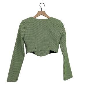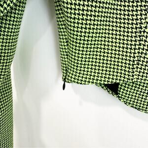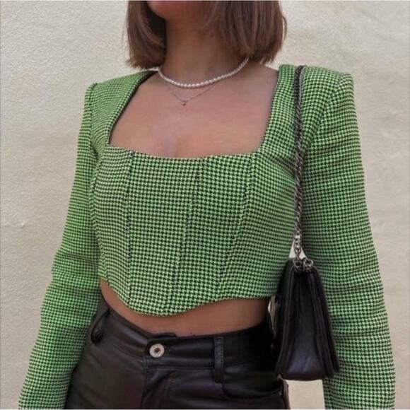 ZAR Houndstooth Neon Green Crop Corset Bustier featuring bustier/corset style boning at the front, long sleeves, padded shoulders, and a hidden side zipper. Square neck and structured silhouette. They have elongated round front hem.
