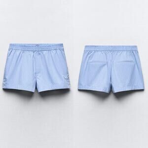 Mid-rise shorts. Elastic waistband, side pockets. Side slits with buttons at the bottom.