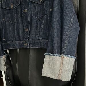 Brand new stylish dark blue denim jacket with button closure and cuffed sleeves.